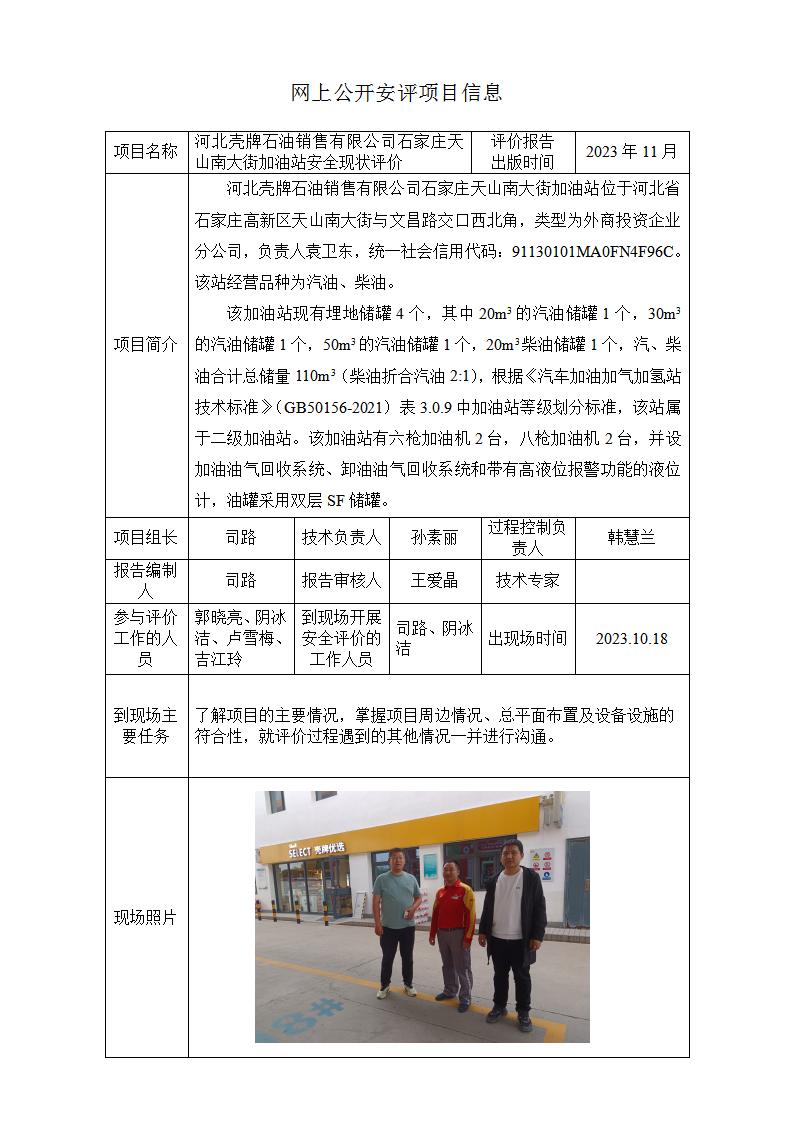 河北殼牌石油銷售有限公司石家莊天山南大街加油站安全現狀評價