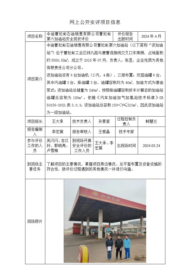 中油曹妃甸石油銷售有限公司曹妃甸第六加油站安全現狀評價