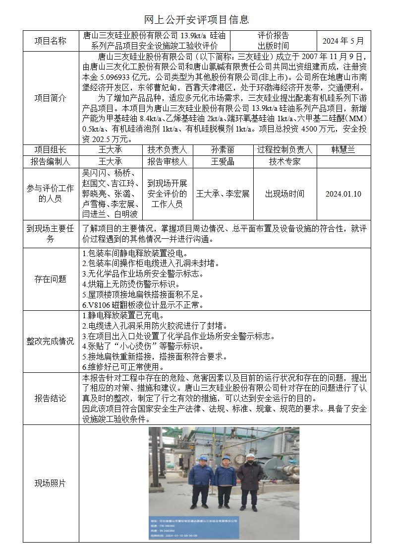 唐山三友硅業(yè)股份有限公司13.9kt/a 硅油系列產(chǎn)品項目安全設(shè)施竣工驗收評價