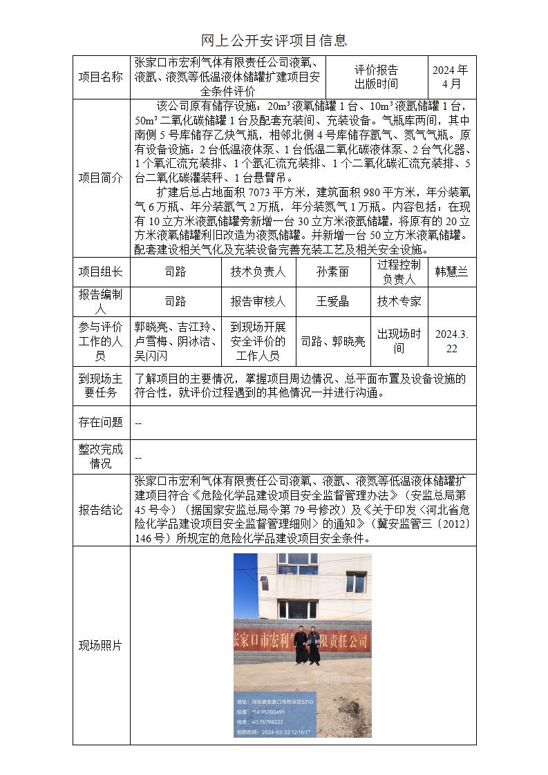 張家口市宏利氣體有限責任公司液氧、液氬、液氮等低溫液體儲罐擴建項目安全條件評價