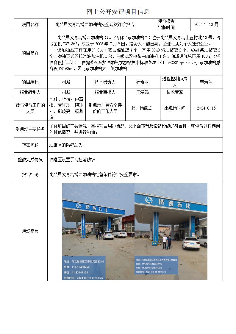 尚義縣大青溝橋西加油站安全現狀評價報告