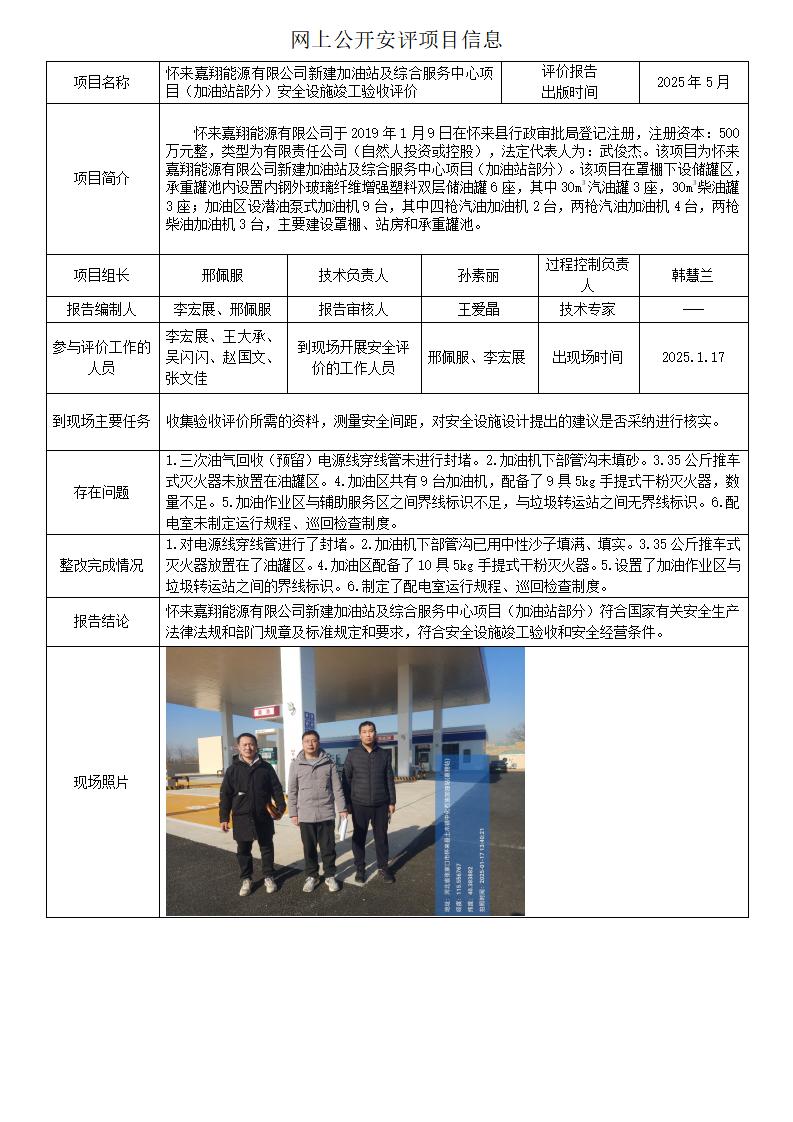 懷來嘉翔能源有限公司新建加油站及綜合服務中心項目(加油站部分)安全設施竣工驗收評價