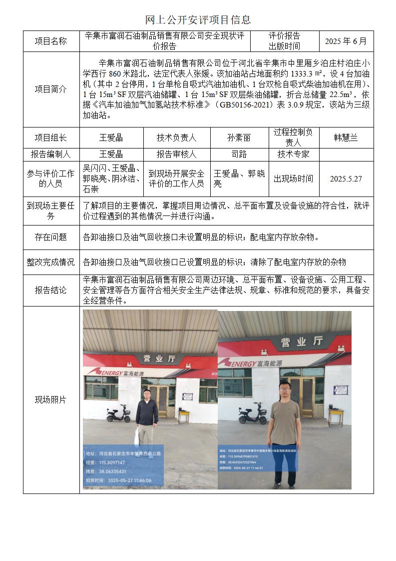辛集市富潤石油制品銷售有限公司安全現狀評價報告