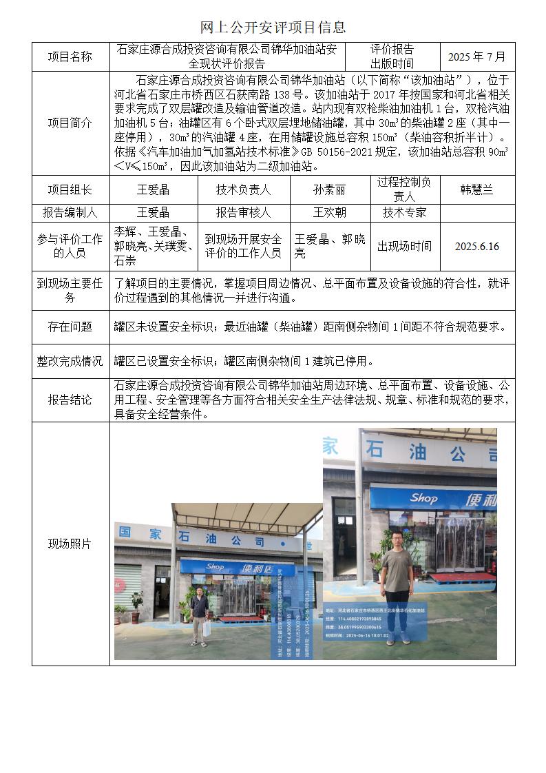 石家莊源合成投資咨詢有限公司錦華加油站安全現(xiàn)狀評價報告
