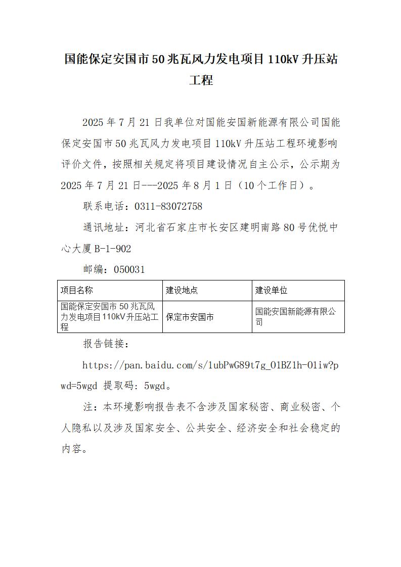 國能保定安國市50兆瓦風力發電項目110kV升壓站工程