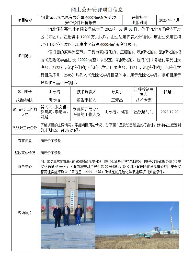 河北澤億嘉氣體有限公司6000Nm3/h空分項目 安全條件評價報告