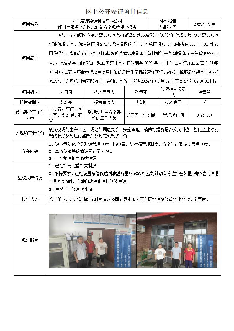河北高速能源科技有限公司威縣南服務區(qū)東區(qū)加油站安全現(xiàn)狀評價報告
