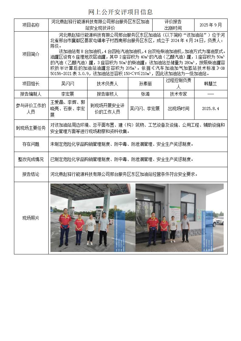 河北燕趙驛行能源科技有限公司邢臺服務區(qū)東區(qū)加油站安全現(xiàn)狀評價